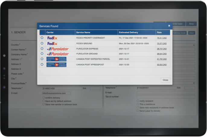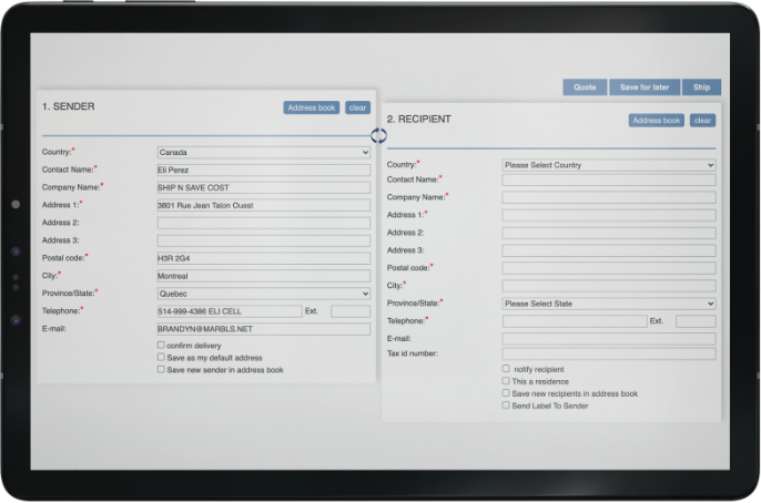 Begin by entering your sender and recipient information, either choose from your address book or enter it for the first time and save it to your address book for future shipments, then the shipment details. If you’re shipping internationally a commercial invoice section will also appear for you to fill out at no additional costs. Xpress For Less makes it easy and clear.