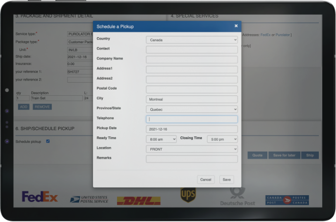 Once you choose the service scheduling a pickup is as easy as clicking a button. Check the schedule pickup box and a pop-up will appear with the pick-up details. Ensure that the correct address and scheduled time is appearing in the window and hit the save button.